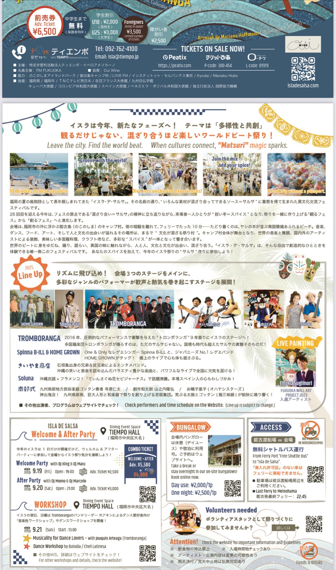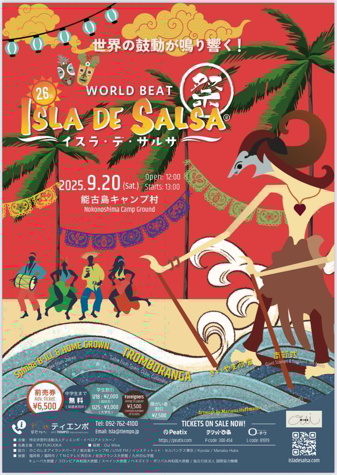 Leave the city. Find the world beat! Join us for Isla de Salsa 2025 on Sept 20th at Nokonoshima Camp Ground, Fukuoka. Music, dance, and flavors from around the globe in a tropical island vibe.